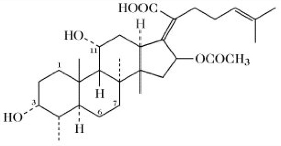 Fusidinsäure, ein tetrazyklisches Triterpenantibiotikum (Abb.); Mr 516,69Da, F. 192°C, [α]D -9°(CHCl3). F. wurde aus Kulturfiltraten von Fusidium coccineum isoliert und wirkt wie die strukturverwandten Triterpenantibiotika Cephalosporin P1 und Helvolinsäure gegen grampositive Erreger. Die Biosynthese erfolgt aus Squalen über 2,3-Epoxysqualen. F. hemmt die Proteinbiosynthese, indem es die Reaktion des Elongationsfaktors EFG an der kleinen Ribosomenuntereinheit unterbindet.