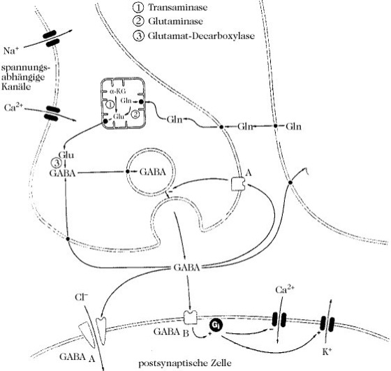GABA-Rezeptoren. Schematische Darstellung der synaptischen Übertragung durch GABA. + = Aktivierung, – = Hemmung, A = präsynaptischer Autorezeptor, Gi = inhibitorisches G-Protein, α-KG = α-Ketoglutarat.