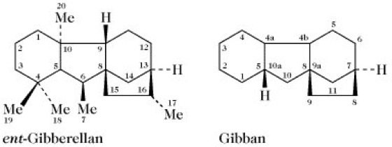 Gibberelline, eine Klasse von weitverbreiteten natürlichen Pflanzenwachstumsregulatoren, die das Längenwachstum stimulieren. Das erste entdeckte G. wurde 1938 aus Gibberella fujikuroi (Fusarium moniliforme), dem Pathogen der Balkan-Reiskrankheit, isoliert. Alle bekannten ~90 Gibberelline enthalten das trizyklische Gibbanringsystem. Die IUPAC empfiehlt, die Nomenklatur und Numerierung vom ent-Gibberellan-System abzuleiten (Abb. 1).