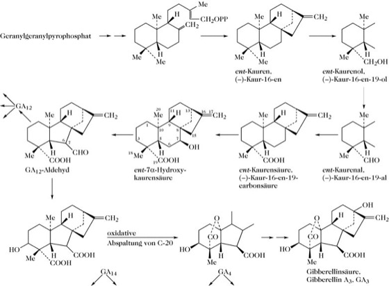 Biosynthese. G. sind Diterpene, die aus Geranylgeranylpyrophosphat (Abb. 2) synthetisiert werden. Das Povital, eine gemeinsame Zwischenstufe in der Biosynthese aller G. ist das Gibberellin-A12-Aldehyd. Danach divergieren die Biosynthesewege beträchtlich. [A. Lang Ann. Rev. Plant Physiol.21 (1970) 537-570; J.E. Graebe u. H.J. Ropers in Phytohormones and Related Compounds – A Comprehensive Treatise vol 1, D.S. Letham, P.B. Goodwin u. T.J.V. Higgins (Hrsg.), North Holland, 1978, S. 107-204; P. Hedden et al. Annu. Rev. Plant Physiol.29 (1978) 149-192; P. Fuchs u. G. Schneider "Synthesis of glucosyl conjugates of [17-2H2]-labelled and unlabelled Gibberellin A34" Phytochemistry42 (1996) 7-10]