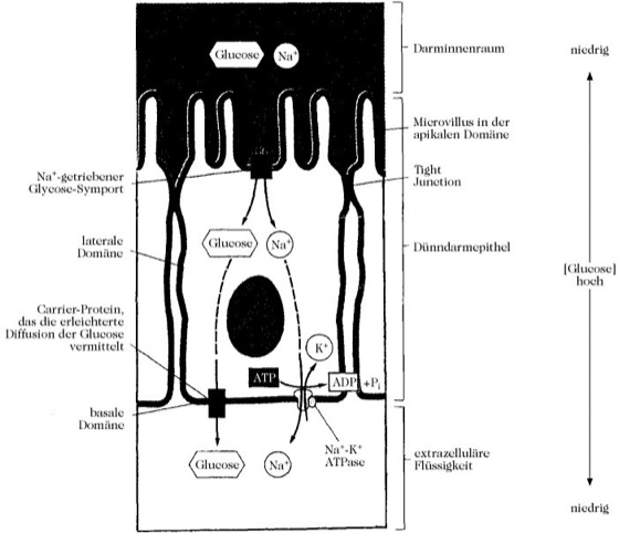 Glucosetransporter, Glucose-Carrier, Transportsysteme für Glucose. Die meisten tierischen Zellen nehmen Glucose durch passiven Transport mit Hilfe von G. aus der extrazellulären Flüssigkeit auf, da dort im Vergleich zum Cytosol die Glucose in hoher Konzentration vorliegt. Diese G. fungieren als Uniporter, da sie mit der Glucose Moleküle eines Typs mit einer durch die Größen Vmax und KM determinierten Geschwindigkeit von einer Seite der Membran auf die andere transportieren. Die G. gehören zu einer Familie homologer Proteine, die durch 12 membrandurchspannende α-Helices gekennzeichnet sind. Der G. in Erythrocyten ist ein Glycoprotein (Mr 55kDa) bestehend aus vier Hauptdomänen. Ein Bündel von 12 membrandurchspannenden α-Helices bildet einen hydrophoben Zylinder, umgeben von einem hydrophilen Kanal, durch den Glucose transportiert wird. Zwischen den Helices 6 und 7 ist eine große Domäne mit einer Häufung geladener Aminosäurebausteine lokalisiert. Eine kleinere, Kohlenhydrat-tragende externe Domäne befindet sich zwischen den Helices 1 und 2, während der C-Terminus eine relativ große cytoplasmatische Domäne bildet. Die Glucosebindungsorte an den beiden Seiten der Erythrocytenmembran besitzen unterschiedliche Konformationen. Im Zustand der Aufnahme sind die Bindungsstellen für die Glucose auf der Außenseite der Doppelschicht zugänglich. Nach dem Durchtritt durch die Pore verursacht eine Konformationsänderung die Öffnung nach innen und damit eine Dissoziation des Glucosemoleküls. Der Erythrocyten-G., als GLUT1 bezeichnet, besitzt eine hochkonservierte Aminosäuresequenz. Die Sequenzübereinstimmung zwischen dem G. des Menschen und der Ratte beträgt 98%.Vier andere G. (GLUT2 bis GLUT5) zeigen nur Sequenzübereinstimmungen von 40-65% mit GLUT1 und besitzen eine unterschiedliche Gewebeverteilung. Beispielsweise findet man GLUT2 vorrangig in den β-Zellen des Pankreas, während GLUT4 hauptsächlich in Muskel- und Fettzellen vorkommt. In Fett- und Muskelzellen wird die Aufnahme von Glucose durch Insulin stimuliert. Im Normalzustand befinden sich die G. GLUT4 in internen Membranvesikeln.Bei Stimulation durch Insulin fusionieren sie mit der Plasmamembran (Exocytose), um Glucose aufnehmen zu können. Nach Beendigung des Insulinstimulus erfolgt die Umkehr durch Endocytose. Im Gegensatz zum passiven Transport mittels der G. erfolgt die Glucoseaufnahme durch Darm- und Nierenzellen aus dem Lumen des Darms bzw. aus den Nierenkanälchen aus Regionen niedriger Glucosekonzentration. Der Transport von Glucose aus dem Darminnenraum in die extrazelluläre Flüssigkeit erfolgt aktiv durch einen Na+-getriebenen Glucose-Symport (Transport). Die Glucose wird durch die apikale Membrandomäne gepumpt und tritt dann ihrem Konzentrationsgradienten folgend mit einem anderen Glucose-Carrier-Protein über die basale und laterale Membrandomäne wieder aus der Zelle heraus. Für die Aufrechterhaltung des den Glucose-Symport treibenden Na+-Gradienten sorgt eine in den basalen und lateralen Membranteilen lokalisierte Na+/K+-ATPase, die eine niedrige Na+-Konzentration aufrecht erhält (Abb.).
