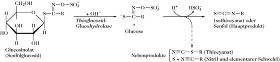 Infolge einer Schädigung der Pflanze werden die G. hydrolysiert und flüchtige, scharfe, tränenreizende Isothiocyanate freigesetzt, die sog. Senföle. Wegen ihrer Fähigkeit, Senföle zu bilden, dienen verschiedene Mitglieder der Cruciferae (z. B. Meerrettich, Senf) als Würzmittel. Die Senföle sind in den Pflanzen normalerweise nicht vorhanden und werden erst gebildet, wenn eine Gewebeschädigung eine Wechselwirkung der G. mit der Thioglucosid-Glucohydrolase (EC 3.2.3.1) erlaubt. Die Aktivierung dieses Enzyms durch seinen Cofaktor Ascorbinsäure dürfte auch durch die Gewebeschädigung gefördert werden. Der enzymatischen Hydrolyse der S-Glucosid-Bindung folgt eine Molekülumlagerung des Aglycons bei gleichzeitiger Produktion von Sulfat und Isothiocyanat (Abb. 1). Wie bei den cyanogenen Glycosiden erfolgt auch die Biosynthese der G. aus Aminosäuren (Abb. 2).
