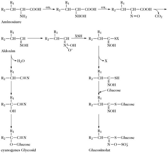 Abb. 2. Glucosinolat. Vorgeschlagener Weg der Biosynthese von Glucosinolaten und cyanogenen Glycosiden aus Aminosäuren.