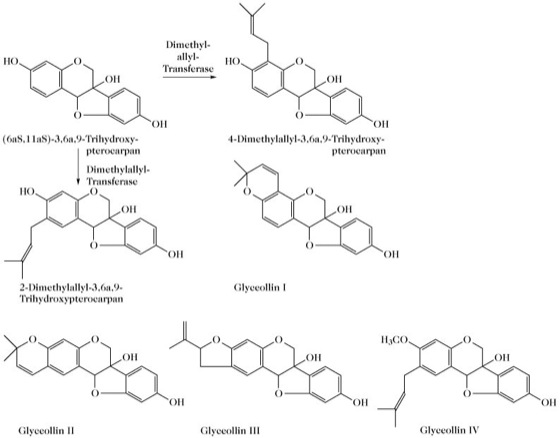 Glyceolline, vier Phytoallexine, die von Glycine max L. als Antwort auf die Infektion durch Phytophthora megasperma var. sojae oder als Antwort auf die Behandlung von Sojabohnencotyledonen oder Zellkulturen mit einem Elicitor produziert werden (Abb.). Mikrosomen aus Glycine-Zellsuspensionen, die durch einen Elicitor angeregt wurden, katalysieren die 6a-Hydroxylierung von 3,9-Dihydroxypterocarpan zu 3,6a,9-Trihydroxypterocarpan. Die Reaktion ist von NADPH und O2 abhängig. [U. Zahringer et al. Z. Naturforsch. 36C (1981) 234-241; M.L. Hagmann et al. Eur. J. Biochem. 142 (1984) 127-131]