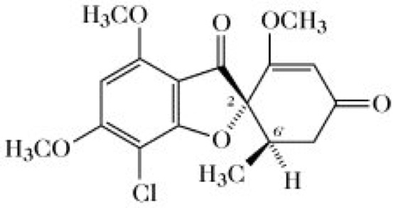 Griseofulvin, ein Antibiotikum mit Spiranstruktur (Abb.), das von Penicillium griseofulvum und P. patulum gebildet wird. Es handelt sich um ein Polyketid, das aus einem Molekül Acetyl-CoA und sechs Molekülen Malonyl-CoA synthetisiert wird. G. kann als systemisches Antimycotikum therapeutisch eingesetzt werden.