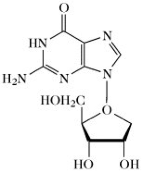 Guanosin, Guo, 9-β-D-Ribofuranosylguanin, ein Nucleosid (Abb.). Als Dihydrat bildet es farblose Kristalle, die bei etwa 110 °C wasserfrei werden; F. ~240 °C (Z.). G. ist wenig löslich in kaltem Wasser, unlöslich in Ethanol und Ether, in verd. Säuren und Alkalien löst es sich unter Salzbildung. G. ist Baustein der Ribonucleinsäuren. Die Nucleotide, Guanosin-5'-mono-, -di- und -triphosphat, spielen eine Rolle im Intermediärstoffwechsel. Biosynthetisch wird als erstes Guaninderivat Guanosinmonophosphat (GMP) aus Inosinmonophosphat gebildet. GMP wird als Geschmacksverstärker verwendet.