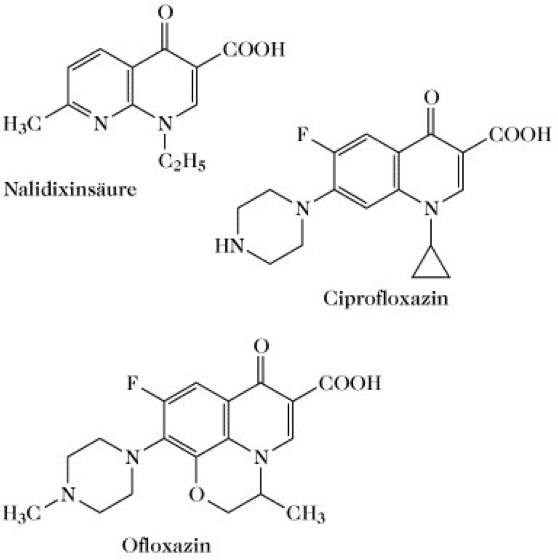 Gyrase-Hemmer, Verbindungen mit bakterizider Wirkung. Sie hemmen die in Bakterien vorhandene DNA-Gyrase (Topoisomerase II, Topoisomerasen), die hauptsächlich die Überspiralisierung (Supercoiling) der bakteriellen DNA nach der Zellteilung unterbindet. Dadurch findet die DNA in der Zelle nicht mehr Platz. Erste Verbindung dieses Wirktyps war Nalidixinsäure, die bei Infektionen des Urogenitaltrakts angewendet wird. Weiterentwicklungen zeigten, dass die 4-Chinolon-3-carbonsäure essenzielles Strukturelement ist. Heteroatome können in den Benzolring eingebaut sein. Wirkungssteigerung und Indikationserweiterung konnte durch Einführung von Fluoratomen und basischen Substituenten erreicht werden. Beispiele sind Ciprofloxazin und Ofloxazin (Abb.)