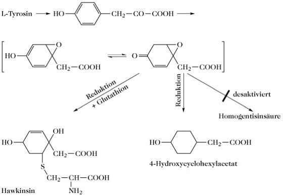 Hawkinsinurie, Tyrosinämie III (Abb.), eine angeborene Stoffwechselstörung, die auf einen Mangel an 4-Hydroxyphenylpyruvat-Dioxygenase (P-Hydroxyphenylpyruvat-Dioxygenase, 4-Hydroxyphenylpyruvat-Hydroxylase, EC 1.13.11.27) zurückzuführen ist. Es kommt zur Ausscheidung von (2-L-Cystein-S-yl-1,4-dihydroxycyclohex-5-en-1-yl)essigsäure (Hawkinsin) und Hydroxylcyclohexylessigsäure im Harn und es bestehen leichte Hypertyrosinämie und Acidose. Behandlung erfolgt durch proteinarme Ernährung und Ascorbinsäureergänzung. Das defekte Enzym setzt vermutlich reaktive Intermediate frei, bevor 4-Hydroxyphenylpyruvat in Homogentisat (Phenylalanin) umgewandelt wird. [B. Wilcken et al. New Engl. J. Med.305 (1981) 865-869]
