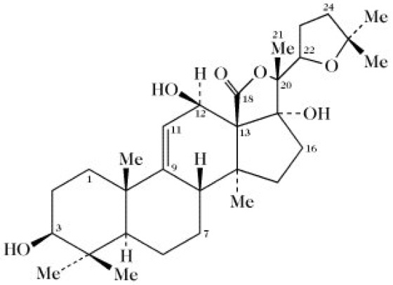 Holothurine. Aglycon von Holothurin A aus Actinopyga agassizi. Der Kohlenhydratrest ist mit der C3-Hydroxylgruppe glycosidisch verknüpft.