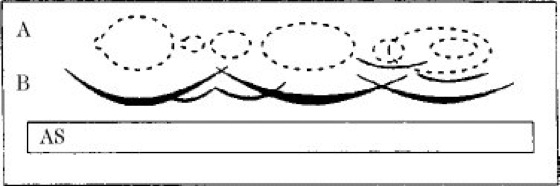 Immunelektrophorese. Prinzip der Immunelektrophorese. A = elektrophoretisch aufgetrennte Proteinmischung; AS = polyklonales Antiserum; B = Präzipitationslinien der Immundiffusion.