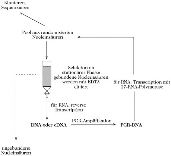 in-vitro-Selektion, in-vitro-Evolution, SELEX (engl. systematic evolution of ligands by exponential enrichment), eine kombinatorische Methode zur Darstellung einer großen Zahl von RNA- und DNA-Oligonucleotiden sowie zur Isolierung spezifisch ligandenbindender Moleküle aus derartigen Pools. Mit diesem Verfahren ist es möglich, routinemäßig DNA- oder RNA-Moleküle zu isolieren, die mit hoher Affinität die unterschiedlichsten Liganden, wie andere Nucleinsäuren, Proteine und auch kleine organische Verbindungen (Aptamere) binden. Unter Umgehung von Design-Strategien ist es auf diesem Wege möglich, sehr seltene Moleküle mit spezifisch ligandenbindenden Eigenschaften aus extrem großen Pools aus Nucleinsäuren mit zufälliger Sequenz zu isolieren. Mit diesem Verfahren können beispielsweise Bindungsstellen für Proteine an Nucleinsäuren studiert werden, um neue Informationen über Protein-Nucleinsäure-Wechselwirkungen zu erhalten. Weiterhin ermöglicht diese Methode, Struktur und Funktion von Ribozymen zu untersuchen. Dadurch konnten die Substratspezifität von katalytischer RNA verändert und auch die katalytische Aktivität verbessert werden. Für die Durchführung des Verfahrens wird zunächst eine große Bibliothek von Oligodesoxynucleotiden von absolut zufälliger Sequenz oder eine Bibliothek degenerierter Oligodesoxynucleotide mit einer Vielzahl von Varianten durch chemische Methoden synthetisiert. Wenn erforderlich, kann diese Bibliothek aus DNA-Sequenzen auch durch in-vitro-Transcription in eine RNA-Bibliothek umkopiert werden. Nachfolgend wird der Pool mit dem Ziel der Anreicherung der funktionellen Moleküle Selektionsschritten unterzogen. Nach jedem Selektionsschritt wird der Pool der erhaltenen Moleküle amplifiziert, wodurch in den nachfolgenden Selektionsschritten die funktionellen Spezies weiter angereichert werden können. Für die Amplifikation wird die Polymerase-Kettenreaktion (PCR) eingesetzt, oder die Vermehrung erfolgt im Transcriptionsschritt. Die Azbbildung zeigt schematisch das Prinzip des Verfahrens, wobei die Selektion ligandenbindender DNA- oder RNA-Moleküle mit Hilfe der Affinitätschromatographie erfolgt. Obgleich zur Selektion von DNA-Molekülen reverse Transcription und Transcription nicht benötigt werden, sind zur Vermeidung der Bildung inaktiver Duplex-DNA aus komplementären Strängen asymmetrische PCR oder Einzelstrangreinigung erforderlich. [M. Famulok u. J.W. Szostak Angew. Chem.104 (1992) 1.001-1.011; G.F. Joyce Gene82 (1989) 83-87; C. Tuerk u. L. Gold Science249 (1990) 505-510]