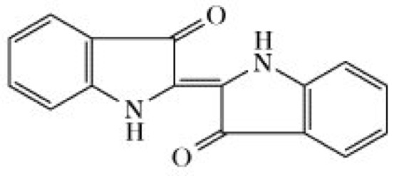 Indigo, ein schon im Altertum und besonders im Mittelalter geschätzter dunkelblauer Küpenfarbstoff (F. 390-392°C). I. wurde früher aus einigen Indigofera-Arten, wie Indigofera tinctoria, und dem Färberwaid (Isatis tinctoria) gewonnen. Letztere enthält den farblosen Ester Indoxyl-5-oxofuranogluconat, und Indigofera das farblose Indoxyl-β-D-glucosid (Indican). Bei einer Beschädigung der Pflanze werden beide Verbindungen enzymatisch hydrolysiert, wobei die entsprechenden Zucker und Indoxyl (3-Hydroxyindol) gebildet werden. Indoxyl lässt sich durch Luftoxidation in I. (Abb.) überführen. Natürlicher I. enthält bis zu 95% I. und als Begleitfarbstoffe Indirubin und Indigobraun. Heute wird I. nur noch auf synthetischem Weg hergestellt. I. zeichnet sich durch Lichtechtheit sowie Säure- und Alkalibeständigkeit aus und ist besonders für Baumwoll- und Wollfärberei geeignet. I. war früher der wichtigste organische Farbstoff. Heute haben halogenierte Derivate und andere indigoide Farbstoffe mehr Bedeutung erlangt. [E. Epstein et al. Nature216 (1967) 547-549]