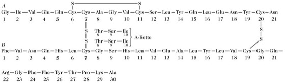 Insulin, ein aus zwei Peptidketten aufgebautes Peptidhormon. Die A-Kette mit 21 und die B-Kette mit 30 Aminosäureresten wird durch zwei interchenare Disulfidbrücken zu einem bizyklischen System verknüpft, während in der A-Kette eine intrachenare Disulfidbrücke enthalten ist. I. wird in den B-Zellen der Langerhansschen Inseln des Pankreas gebildet und senkt als Gegenspieler des Glucagons bei physiologischem Bedarf den Blutglucosespiegel. Die typischen I.-Mangelsymptome ergeben das Krankheitsbild des Diabetes mellitus, deren Ursachen weitgehend unbekannt sind. I. wurde 1921 durch Banting und Best als Diabetes-kompensierendes Prinzip entdeckt. 1926 gelang Abel die Reindarstellung und Kristallisation und 1955 wurde durch Sanger die Primärstruktur aufgeklärt. Schließlich ermittelte 1969 Dorothy Hodgkin die Raumstruktur durch Röntgenkristallstrukturanalyse. I. wurde lange Zeit industriell durch Extraktion von Pankreata aus Schwein und Rind gewonnen. 1963 gelang den Arbeitskreisen um Helmut Zahn in Aachen, Katsoyannis in Pittsburgh und Chu Wang in Shanghai die Totalsynthese der beiden Ketten und deren Kombination durch statistische Oxidation zum Insulin mit biologischer Aktivität. Der eindeutige Strukturbeweis für die von Sanger vorgeschlagene Primärstruktur (Abb. 1) konnte erst 1974 durch eine von Rittel und Mitarbeitern beschriebene Totalsynthese des Humaninsulins erbracht werden, bei der auch die Disulfidbrücken im Verlauf der Chemosynthese in eindeutiger Weise unter Vermeidung von Disulfidaustausch geknüpft wurden. Aufgrund des hohen Bedarfs an I. (Weltjahresbedarf beträgt gegenwärtig ca. 6 Tonnen mit einem Marktwert von ca. 1,8 Mrd. DM) ist die gentechnische Produktion die Methode der Wahl, obgleich auch die Semisynthese des Humaninsulins aus Schweineinsulin durch enzymatischen Aminosäureaustausch prinzipiell mit den gentechnischen Produktionsverfahren konkurrieren kann, wenn genügend Schweineinsulin durch Extraktionsverfahren bereitgestellt werden könnte. Aufgrund der komplexen Struktur des I. stellt die Chemosynthese keine Produktionsalternative dar. Obgleich Humaninsulin weniger immunogen ist als Schweine- oder Rinderinsulin, konnte es letzteres nicht sofort verdrängen, weil gut eingestellte Diabetiker nicht unbedingt zum Humaninsulinpräparat wechseln müssen. [D. Brandenburg, Insulin Chemistry in Handbook of Experimental Pharmacology Vol. 92, P. Cuatrecas u. S. Jacobs (Hrsg.) Springer-Verlag, Berlin 1990]