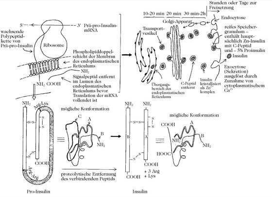 Die meisten Arten besitzen nur einen Insulintyp, jedoch liegen bei drei Nagetierspezies (Laborratte, Maus, Spitzmaus) und zwei Fischarten (Thunfisch, Krötenfisch) zwei verschiedene Hormone vor. Die Ratte ist im Besitz von zwei Insulingenen, während bei Menschen nur eines vorhanden ist. Die Ratten- und Humaninsulingene wurden sequenziert [G.I. Bell et al. Nature 284 (1980) 26-32]. Das reife mRNA-Transcript codiert für Prä-Pro-Insulin, das eine aminoterminale hydrophobe, 16 Reste umfassende Signalsequenz trägt (Signalhypothese; Abb. 2). Sobald Prä-Pro-Insulin durch die Membran in das Lumen des endoplasmatischen Reticulums tritt, wird die Signalsequenz entfernt und es entsteht Pro-Insulin. Pro-Insulin wird zum Golgi-Apparat transportiert, wo die proteolytische Entfernung einer internen Sequenz, des Verbindungspeptids (connecting peptide, C-Peptid), begonnen wird. In den Speichergranula wird die Hydrolyse fortgesetzt. Zusätzlich zu anderen Strukturhomologien enthält das C-Peptid verschiedener Arten an seinem Aminoende Arg-Arg und an seinem Carboxyende Lys-Arg. Diese stellen die proteolytischen Spaltungsstellen für den Angriff durch trypsinähnliche Enzyme dar. Die Disulfidbrückenbindungen werden unmittelbar nach der Translation gebildet und sind im Pro-Insulin vorhanden. Das I. wird durch Fusion der Membran reifer Speichergranula mit der Plasmamembran der Zelle freigesetzt (Sekretion). Die Insulinausschüttung, die als Antwort auf Metabolite der Atmung(z. B. Glucose) oder bestimmte Hormone erfolgt, wird durch eine Konzentrationserhöhung von freien cytosolischen Ca2+-Ionen ausgelöst. Die Ca2+-Konzentrationserhöhung wird durch vermehrtes Einströmen von Ca2+ durch spannungsabhängige Ca2+-Kanäle und durch Mobilisierung intrazellulärer Ca2+-Reservoirs verursacht.