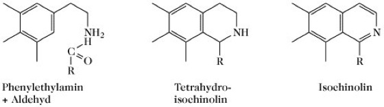 Isochinolinalkaloide, eine große Gruppe von Alkaloiden, die im Pflanzenreich weit verbreitet vorkommen. Der heterozyklische Grundkörper bildet sich in vivo vornehmlich im Zuge einer Mannich-Kondensation aus einem Phenylethylaminderivat und einer Carbonylkomponente. Die dabei entstehenden Tetrahydroisochinolinderivate gehen durch Dehydrierung in Isochinolinderivate über (Abb.). Nach der Natur des Carbonylbausteins kann man zwischen verschiedenen Strukturtypen unterscheiden, die wiederum typisch für gewisse Pflanzenarten sind und deshalb nach ihnen benannt werden (Tab.). Durch sekundäre Zyklisierungen als Folge von Phenoloxidationen, durch Umlagerungen und Ringspaltungen können Verbindungen mit komplizierten Ringsystemen entstehen, die sich nur durch ihren gemeinsamen Biosyntheseweg als I. ausweisen.