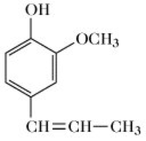 Isoeugenol, 2-Methoxy-4-propenylphenol (Abb.), eine farblose Flüssigkeit; F. -10 °C, Sdp. 266°C, n ![]()
