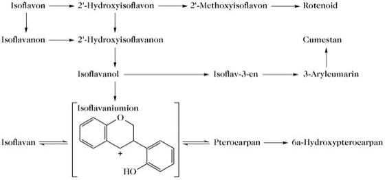 Biosynthese. Die Biosynthese aller Flavonoide verläuft über Chalkone. Die 1,2-Arylwanderung, die zum charakteristischen Isoflavonoidgerüst führt, spielt sich während der Umwandlung der Chalkone ab und wird von einer Nettooxidation begleitet. Im Gegensatz dazu, ist an der Biosynthese aller anderen Flavonoide eine Umwandlung des Chalkons in ein Flavanon mit der gleichen Molekülstrukturformel beteiligt. Einer interessanten Theorie für den Mechanismus der Arylwanderung zufolge, verläuft die Phenoloxidation über eine Spirodienonzwischenstufe (Abb. 2) [A. Pelter et al. Phytochemistry10 (1971) 835-850]. In Übereinstimmung mit diesem vorgeschlagenen Mechanismus steht die Erkenntnis, dass 4-Methoxychalkone nicht als Substrate für die Wanderung fungieren. Tatsächlich wären nur zwei Chalkone als Substrate geeignet, das 2',4',4-Trihydroxychalkon und das 2',4',6',4-Tetrahydroxychalkon, aus denen Daidzein und Genistein entstehen könnten. Formononetin und Biochanin A können durch Methylierung von Daidzein und Genistein entstehen, es existieren jedoch zwingende Hinweise dafür, dass die 4'-Methylierung hauptsächlich während der Umwandlung der Chalkone vor sich geht, d. h. während der Arylwanderung. Diese vier I. könnten dann als Vorstufe praktisch aller bekannten natürlichen I. dienen. I., denen die Sauerstofffunktion in 4'-Position fehlt, sind selten. Diese können durch eine analoge Phenoloxidation von 2-Hydroxychalkonen, die zu 2'-Hydroxy- (oder -Methoxy-) Flavonen führt, gebildet werden. Das Substitionsmuster des B-Rings der Isoflavone scheint durch die Hydroxylierungsreihenfolge 4'→2',4'und 4'→4',5'→2',4',5' bestimmt zu sein. Die Substition im A-Ring in den Positionen 7 und 5,7 ist durch die Chalkone vorgegeben, bei Isoflavonen ist jedoch eine weitere Hydroxylierung in Position 6 möglich. Die biosynthetischen Beziehungen innerhalb der Hauptgruppe der I. wurden hauptsächlich mit Hilfe von Isotopenmarkierungen (14C und 3H) untersucht und sind in Abb. 3 gezeigt [P.M. Dewick in The Flavonoids: Advances in Research J.B. Harborne u. T.J. Mabry, Hrg., Chapman and Hall, 1982, 535-640; J.L. Ingham "Naturally Occuring Isoflavonoids (1855-1981)" in Progress in the Chemistry of Organic Natural Products43 (1983) 1-266].
