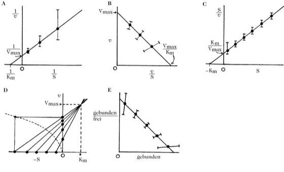 Kinetische Datenauswertung. Abb. Lineare Transformation der Gleichung v = VmaxS/(Km + S). Die Fehlerbalken sind ebenfalls eingezeichnet. A: Lineweaver-Burk-, oder doppelt reziprokes Diagramm; B: Eadie-Hofstee-Diagramm; C: Hanes-Wilkinson-Diagramm; D: Eisenthal-Cornish Bowden-, oder direkt lineares Diagramm; E: Scatchard-Diagramm, das zur Bestimmung von Bindungskonstanten herangezogen wird.