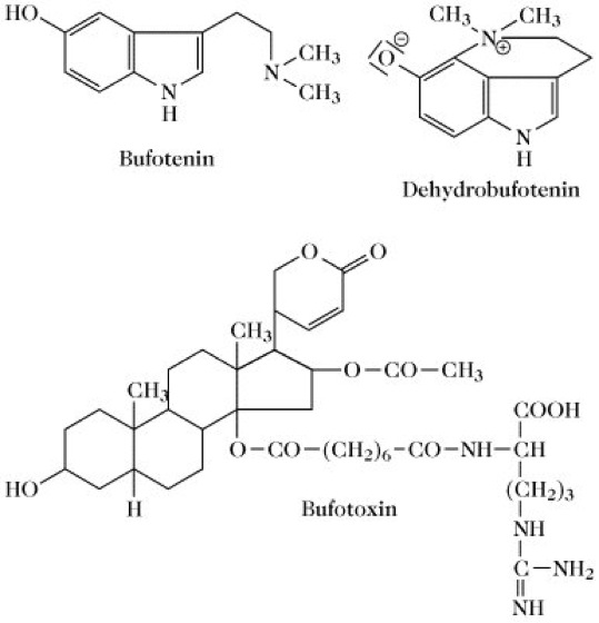 Krötengifte, Giftstoffe, die im Hautdrüsensekret von Kröten (Bufonidea) enthalten sind (Abb.). Man unterscheidet: 1) Bufadienolide (Bufogenine) mit digitalisartiger Herzwirksamkeit (herzwirksame Glycoside), z.B. Bufotoxin. Sie verstärken die Herztätigkeit und verlangsamen die Schlagfrequenz. Im Krötenblut sind die Bufadienolide in einer Verdünnung von 1 : 5.000 bis 1 : 20.000 vorhanden und für die normale Herztätigkeit notwendig. 2) Basische Giftstoffe, die zu den Alkaloiden zählen und chemisch Tryptamin- bzw. Indolderivate darstellen, z.B. Bufotenin, Dehydrobufotenin und O-Methylbufotenin. Die basischen Giftstoffe mancher Krötenarten enthalten Adrenalin und ähnliche Substanzen. Bufotenine steigern den Blutdruck und wirken lähmend auf die motorischen Zentren des Gehirns und des Rückenmarks. K. sind von anästhesierender Wirkung, die ein Mehrfaches des Cocains beträgt.