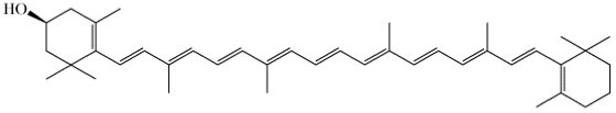 Kryptoxanthin, (3R)-β,β-Caroten-3-ol (Abb.), ein Xanthophyll (Mr 552,85Da, F. 169°C). Es ist ein verbreiteter Pflanzenfarbstoff, der besonders in Früchten vorkommt, z.B. Paprika, Orangen, Mandarinen und Papaya, außerdem in Mais und im Eidotter. Als Provitamin liefert ein Molekül K. ein Molekül Vitamin A.