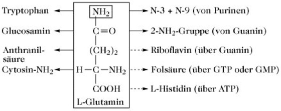 L-G. stellt daher eine zentrale Zwischenstufe im Stickstoffmetabolismus dar. Sie stellt den Amidstickstoff zur Verfügung (durch Transamidierung), der für die Synthese einer Vielzahl von anderen Verbindungen (Abb.) benötigt wird. In der Niere spielt L-G. ebenfalls eine wichtige Rolle, da es hydrolysiert wird und der gebildete freie Ammoniak die Reabsorption von Kalium- und Natriumionen erleichtert. L-G. ist für das Gehirn ein wichtiger Nährstoff (L-Glutaminsäure). Da L-G. mit seiner Amidgruppe an der Biosynthese von Hexosaminen beteiligt ist, fördert es die Regeneration von Mucoproteinen und des Darmepithels.