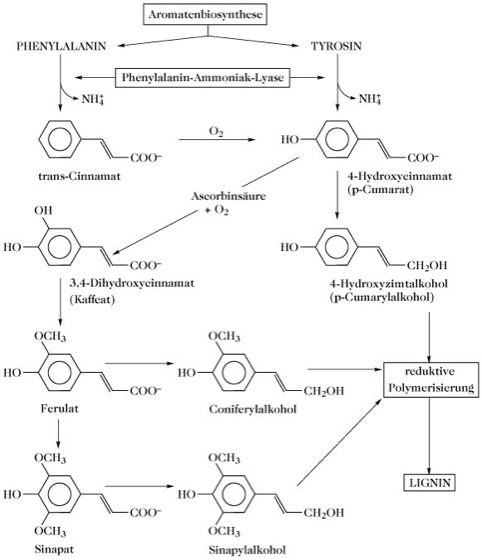 Biosynthese. Primäre Ligninbausteine sind Hydroxyzimtalkohole nach Art des Coniferyl-, Sinapin- und p-Cumarylalkohols. Das L. der Nadelhölzer wird vor allem aus Coniferylalkohol und wechselnden, stets kleinen Anteilen von Sinapin- und p-Cumarylalkohol aufgebaut. Das L. zweikeimblättriger Bedecktsamer, insbesondere der Laubhölzer, wird vor allem aus Sinapin- (~44%) und Coniferylalkohol (48%) gebildet, neben 8% p-Cumarylalkohol. Das L. von Gräsern setzt sich aus p-Cumaryl- (~30 %), Coniferyl- (~50 %) und Sinapyl- (~20 %) Alkohol zusammen. Diese primären Ligninbausteine werden aus den aromatischen Aminosäuren L-Phenylalanin und L-Tyrosin gebildet (Abb.). Die erste Reaktion wird durch L-Phenylalanin-Ammoniak-Lyase (EC 4.3.1.5) katalysiert. Dieses Enzym wird unter Beteiligung von Phytochrom durch Licht induziert und ist für die Synthese von pflanzlichen phenolischen Verbindungen aus Phenylalanin und Tyrosin von allgemeiner Bedeutung.