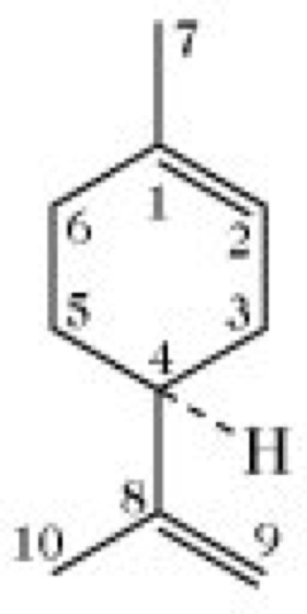 Limonen, ein monozyklischer Terpenkohlenwasserstoff, farbloses Öl mit zitronenartigem Geruch (Abb.); Sdp. 175-176°C bei 102·103Pa; +-L.: αD 126,8°; -L.: αD -122,6°. Es wird in Gegenwart von Luft und Licht leicht oxidiert. L. ist als D- und L-Form sehr weit in etherischen Ölen verbreitet. D-L. lässt sich durch fraktionierte Destillation von Pomeranzenschalen oder Kümmelöl, L-L. aus Edeltannenzapfenöl gewinnen. Das Racemat wird als Dipenten bezeichnet. L. wird in großem Umfang in der Riechstoffindustrie verwendet.