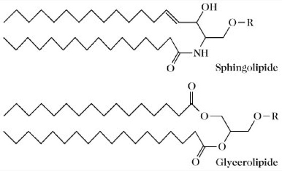 Lipide. Allgemeine Struktur der komplexen Lipide. Bei Phospholipiden sind R = Phosphorsäure oder Phosphorsäureester; bei Glycolipiden sind R = Mono- oder Oligosaccharidreste.