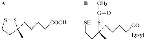Liponsäure. A: (3R)-1,2-Dithiolan-3-pentancarbonsäure, die oxidierte Form der Liponsäure; B: 6S-Acetyl-6,8-Dithiolactonsäure. Das Acetylderivat der reduzierten Form der Liponsäure ist über eine Amidbindung mit der ε-Aminogruppe eines Lysinrests an ein Enzymprotein gebunden.