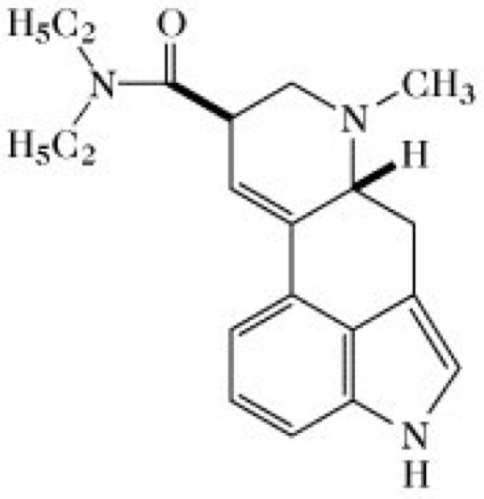 Lysergsäurediethylamid, LSD, ein nicht natürlich vorkommendes Derivat der D-Lysergsäure (Abb.). LSD ist das am stärksten wirksame bekannte Halluzinogen. Halluzinogene Lysergsäureabkömmlinge kommen in der mexikanischen Zauberdroge Ololiuqui, den Samen des Windengewächses Rivea corymbosa vor, nämlich Lysergsäureamid (Ergin) und Lysergsäurehydroxyethylamid. LSD kann halbsynthetisch aus Mutterkorn-Alkaloiden gewonnen werden, die z.B. in der Form des Ergometrins ebenfalls in Rivea-Samen vorkommen. Die halluzinogene Wirkung des LSD, die durch schizophrenie-ähnliche Zustände gekennzeichnet ist, wurde von A. Hofmann während der Rekristallisation einer LSD-Tartratprobe zufällig erkannt. Der Gebrauch von LSD zeigt verheerende gesundheitliche Folgen.