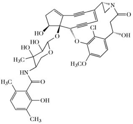 Maduropeptin, MDP, ein aus der Kulturflüssigkeit von Actinomadura madurae isoliertes antitumorwirksames Chromoprotein. M. besteht aus einem Endiin-enthaltenden Chromophor (Abb.) und einem sauren stabilisierenden Protein (Mr 32kDa). Der Chromophor bildet einen labilen neungliedrigen Endiin-Ring, zeigt aber keine Homologie zu ähnlichen Endiin enthaltenden Chromoproteinen (Neocarcinostatin, Macromomycin, Actinoxanthin oder Kedarcidin). Der M.-Chromophor allein besitzt antibakterielle und cytotoxische Wirkungen. Er spaltet Doppelstrang-DNA in vitro an speziellen biologisch kritischen DNA-Sequenzen, während das proteaseähnliche Apoprotein den Chromophor stabilisiert und solubilisiert. Ebenso wie Neocarcinostatin und Kedarcidin katalysiert M. in vitro den Abbau von Histonen zu niedermolekularen Peptiden. [N. Zein et al., Biochemistry34 (1995) 11.591]