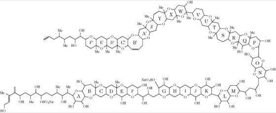 Maitotoxin, ein aus Zellkulturen des Dinoflagellaten Gambierdiscus toxicus isoliertes wasserlösliches und hochtoxisches Algengift (LD50 50 ng/kg, Maus, i.p.). Das über die Nahrungskette angereicherte Toxin ist eine der Ursachen für die sog. Ciguarata-Fisch-Vergiftung, deren Symptome sich in Magen-Darm-Verstimmung, Herz-Kreizlauf-Beschwerden, Juckreiz, Umkehrung der Heiß-Kalt-Empfindung u.a. äußern. Das aus Polyether-Einheiten aufgebaute M. (Mr 3.422Da) ist eines der größten bisher bekannten natürlich vorkommenden "Nichtbiopolymeren" (Abb.). [K. Tachibana et al., Angew. Chem.108 (1996) 1.782]