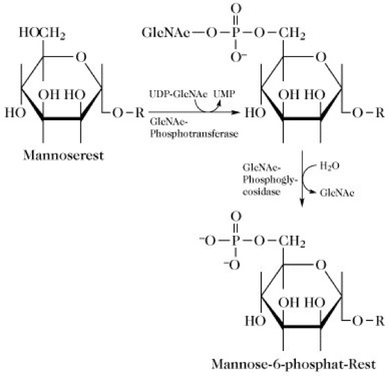 Mannose-6-phosphat, M6P, ein molekularer Marker für die Lenkung von Proteinen zu den Lysosomen. Ein für den Transport in die Lysosomen bestimmtes Glycoprotein erhält seine M6P-Markierung im cis-Kompartiment des Golgi-Apparats. Dieser Phosphattransfer wird durch die N-Acetylglucosamin(GlcNAC)-Phosphotransferase katalysiert. Danach wird vom Phospho-N-acetylglucosamin-Intermediat durch die GlcNAc-Phosphoglycosidase der N-Acetylglucosaminrest abgespalten (Abb.). Im Golgi-Apparat befindet sich ein integrales Membranprotein, der Mannose-6-phosphat-Rezeptor, der die so markierten Proteine erkennt. [T.J. Baranski et al., J. Biol. Chem. 267 (1992) 23.342-23.348]