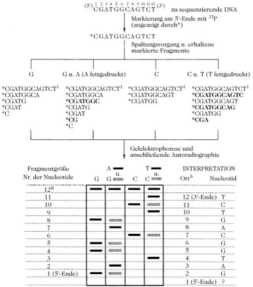Maxam-Gilbert-Verfahren, eine Methode der Nucleinsäuresequenzierung zur Sequenzbestimmung von DNA. Hierbei werden DNA-Einzelstrangfragmente, die an einem Ende, oft dem 5'-Ende, radioaktiv markiert wurden, chemisch gespalten. Zusätzlich können die DNA-Fragmente mit [χ-32P]ATP in der Gegenwart von Polynucleotid-5'-Hydroxylkinase inkubiert werden, wobei an die Hydroxylgruppe des 5'-Endes eine [32P]-Phosphatgruppe addiert wird. Wenn diese Hydroxylgruppe bereits eine Phosphatgruppe trägt, wie es bei nativer DNA der Fall ist, muss diese zuerst durch Inkubation der DNA mit alkalischer Phosphatase aus E. coli oder Kalbsdarm entfernt werden. Dann werden aliquote Teile der Präparation mit markierter DNA mindestens vier verschiedenen chemischen Verfahren unterworfen, durch die ein spezifisches Nucleosid (d.h. eine N-Base und ihre N-glycosidisch gebundene 2-Desoxy-D-ribose) oder eine spezifische Nucleotidart von der Polynucleotidkette abgespalten wird. Die Bedingungen, unter denen jedes dieser Spaltungsverfahren durchgeführt wird, werden so gewählt, dass jedes markierte DNA-Molekül in der DNA-Probe im Durchschnitt nur einmal gespalten wird, wobei die Spaltstelle zufällig lokalisiert ist. Es entstehen zwei Spaltprodukte: eines mit einem [32P]Phosphat an seinem 5'-Ende und einem nichtmarkierten Phosphat an seinem 3'-Ende und eines mit einer nichtmarkierten Phosphatgruppe an seinem 5'-Ende und entweder einer Hydroxylgruppe oder einer nichtmarkierten Phosphatgruppe an seinem 3'-Ende. Von diesen beiden Produkten wird mit Hilfe der anschließenden Autoradiographie nur das markierte detektiert. Wenn das genannte Verfahren beispielsweise auf die Sequenz (5')CGATGGCAGTCT(3') angewandt wird, entstehen bei Spaltung vor G die folgenden fünf 32P-markierten Fragmente: 32P-C, 32P-CGAT, 32P-CGATG, 32P-CGATGGCA. Dieser Satz wird dann elektrophoretisch aufgetrennt. Die analogen Fragmentsätze, die sich bei den anderen Spaltungsverfahren ergeben, befinden sich in dazu parallelen Bahnen. Auf Sequenzgelen (Elektrophorese bei ~8M Harnstoff und ~70 °C, um Wechselwirkungen über Wasserstoffbindungen zu unterdrücken) können Fragmente getrennt werden, die sich in ihrer Länge um einen Nucleotidrest unterscheiden. Die Lage der getrennten Fragmente in jeder Bahn wird durch Autoradiographie bestimmt. Aus dem Bandenmuster kann die vollständige Nucleotidsequenz der untersuchten DNA abgeleitet werden (Abb.).