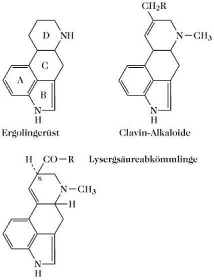 Die M. bilden zwei Untergruppen (Lysergsäurederivate und Clavin-Alkaloide), in Abhängigkeit vom Oxidationszustand des Substituenten an C8 des tetrazyklischen Ergolinringsystems (Abb. 1). Die erste Gruppe umfasst Säureamide mit einfachen Aminen (z.B. Ergometrin) oder zyklischen Tripeptiden (Peptidalkaloide, z.B. Ergotamin). Am Aufbau des Tripeptids sind die Aminosäuren D-Prolin, L-Leucin, L-Valin, L-Phenylalanin oder L-Alanin beteiligt. Die Verknüpfung mit der Carboxylgruppe der Lysergsäure übernehmen entweder Alanin (Ergotamintyp) oder Valin (Ergotoxintyp).