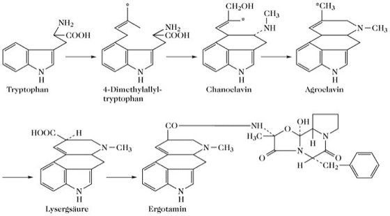 Biosynthese. M. entstehen bei Claviceps purpurea und wahrscheinlich auch bei höheren Pflanzen aus Tryptophan und Isopentenylpyrophosphat (Terpene). Über 4-Dimethylallyltryptophan führen weitere Reaktionen (Hydroxylierung, Methylierung, Decarboxylierung und Bildung einer neuen C-C-Bindung) zu dem Alkaloid Chanoclavin, aus dem alle anderen Clavin-Alkaloide und die Lysergsäurederivate hervorgehen. Der Peptidteil der Alkaloide vom Ergotamin- und Ergotoxintyp wird durch einen Multienzymkomplex gebildet (Abb. 2). Zur Gewinnung der M. werden die nach künstlicher Infektion von Roggen gesammelten Sclerotien aufgearbeitet. Außerdem werden M. auch in Kulturen des Pilzes auf künstlichen Nährböden gebildet.