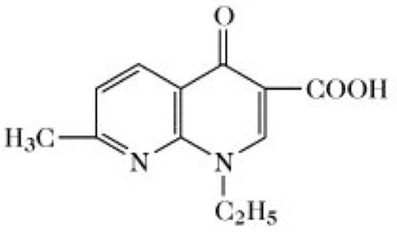 Nalidixinsäure, 1-Ethyl-7-methyl-1,8-naphthyridin-4-on-3-carbonsäure (Abb.; Mr 232,2Da), ein Antibiotikum, das therapeutisch gegen gramnegative Bakterien verwendet wird und die DNA-Replikation in sich vermehrenden Bakterienkulturen hemmt.