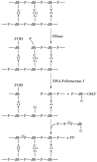 Nick Translation, ein Verfahren zur Herstellung von 32P-markierten DNA-Sonden für Hybridisierungstests. In diesem Zusammenhang bezieht sich der Begriff "Translation" nicht auf den Translationsprozess der Proteinsynthese, sondern auf die Translationsbewegung einer Spaltungsstelle bzw. eines Bruchs (engl. nick) entlang eines Duplex-DNA-Moleküls. Die Brüche werden durch eine stark eingeschränkte DNase-Behandlung an weit voneinander entfernten Stellen in die DNA eingefügt. Die gebildeten Schnittstellen weisen freie 3'OH-Gruppen auf. Anschließend werden mit Hilfe von E.-coli-DNA-Polymerase I gleichzeitig die 5'-Mononucleotidenden entfernt (5'→3'-Exonucleaseaktivität der Polymerase I) und die passenden Nucleotide aus 32P-markierten Desoxynucleosidtriphosphaten (α32P-dNTP, mit N = G, A, T oder C) eingebaut. In Gegenwart aller vier radioaktiv markierten Desoxynucleosidtriphosphate wird die Markierung schrittweise auf zufällige Weise in die Duplex inkorporiert, so dass die DNA letztendlich gleichmäßig markiert ist. Wenn nur eines der Desoxynucleosidtriphosphate markiert ist, wird das Markierungsmuster ungleichmäßig, besonders in Bezug auf Homopolymerbereiche (Abb.). [P.W.J. Rigby et al. J. Mol. Biol. 113 (1977) 237-251]