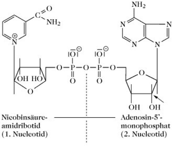 Abb. 1. Nicotinsäureamid-adenin-dinucleotid. Struktur des NAD. Im Nicotinsäureamid-adenin-dinucleotidphosphat (NADP) ist an C2 des zweiten Nucleotid (Pfeil) eine zusätzliche Phosphatgruppe vorhanden.