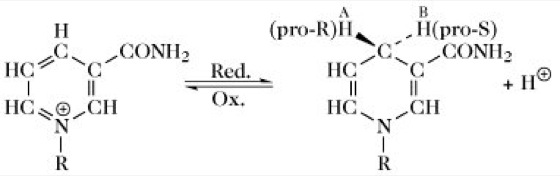 Durch die Reduktion von NAD wird am C4 des Pyridinrings ein prochirales Zentrum eingeführt. Die Übertragung des Hydridions (ein Proton mit einem Elektronenpaar) auf NAD+ verläuft stereospezifisch, d.h. der neu eingeführte Wasserstoff nimmt entweder die pro-R- oder die pro-S-Konfiguration ein [entsprechend der älteren Nomenklatur ist der Wasserstoff entweder auf der A(α)- oder der B(β)-Seite des reduzierten Pyridinrings gebunden]. Beispielsweise übertragen die Ethanol-, Lactat- und Malat-Dehydrogenasen den Wasserstoff auf die pro-R-Position und spalten ihn auch wieder aus dieser Position ab, während 3-Phosphoglycerinaldehyd- und Glucose-Dehydrogenase pro-S-spezifisch sind.