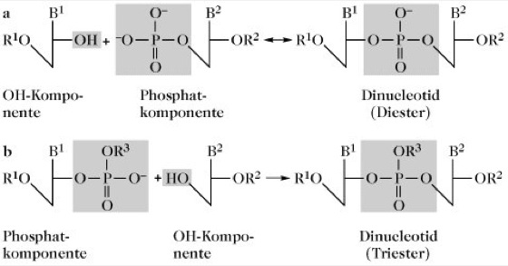 Oligonucleotidsynthese, die chemische Synthese von Oligonucleotiden durch Knüpfung einer Phosphodiesterbindung zwischen der 5'-Hydroxy-Gruppe des einen Nucleotids und der 3'-Phosphat-Gruppe des anderen Nucleotids oder umgekehrt zwischen einer 3'-Hydroxygruppe und einem 5'-Phosphat zweier Nucleotide. Für präparative O. wird wegen der höheren chemischen Reaktivität der primären 5'-Hydroxygruppe fast ausschließlich die zuerst genannte Reaktion verwendet. Alle funktionellen Gruppen, die während der Knüpfung der Internucleotidbindung unerwünschte Nebenreaktionen eingehen können, müssen durch Einführung selektiv abspaltbarer Schutzgruppen reversibel blockiert werden. Bei der Synthese von Oligoribonucleotiden muss auch die zusätzliche 2'-Hydroxygruppe geschützt werden.