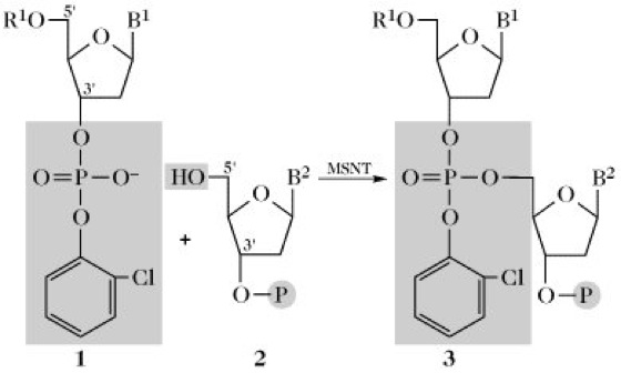 Kondensationsmittel (Aktivierungsmittel) für die Knüpfung der Internucleotidbindung sind abhängig von der gewählten Synthesestrategie. Während sich Dicyclohexylcarbodiimid (DCC), Mesitylensulfonylchlorid (MS) und Triisopropylbenzolsulfonylchlorid (TPS) als effektiv bei der Diestermethode erwiesen haben, wird für die Triestermethode bevorzugt 1-(Mesitylen-sulfonyl)-3-nitrotriazol (MSNT) verwendet.