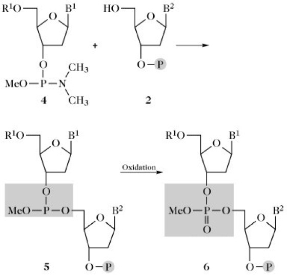 2) Phosphit-Triester-Polymersynthese (Abb. 3). Grundlage dieses Verfahrens ist die Phosphitmethode, bei der zunächst ein Nucleotidphosphitester (5) gebildet wird, der anschließend mit Iod zum Phosphotriester oxidiert wird. Die partiell geschützten Desoxynucleosid-Phosphoramidite (4) (Phosphoramidit-Methode), dargestellt aus dem entsprechenden Nucleosid und Chloro(N,N-dimethylamino)-methoxyphosphan, CH3O-P(Cl)-N(CH3)2, sind äußerst reaktiv und ermöglichen nahezu quantitative Umsätze bei Kupplungszeiten von nur 5min. Diese hochreaktiven Reagenzien (Reaktionsbomben) stellen in Verbindung mit Injektionsspritze und Serumkappe das Handwerkszeug des modernen Nucleinsäuresynthetikers dar. Die Dauer eines Reaktionszyklus wird mit etwa 30 min angegeben. Als polymerer Träger fand unter anderem Kieselgel Verwendung. Nach der Synthese werden die Schutzgruppen abgespalten und das Oligonucleotid vom Träger abgelöst. Die Reinigung erfolgt wie unter 1) beschrieben, wofür zusätzlich Reversed-Phase-Chromatographie und Gelchromatographie wichtig sind. Unter den besten Bedingungen kann man heute Oligonucleotide bis zu einer Länge von etwa 200 Basen in einem Stück synthetisieren.