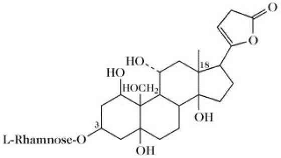 Ouabain, ein Vetreter der Strophanthusglycoside (Abb.). O. ist ein spezifischer Inhibitor der membrangebundenen Na+-K+-ATPase, die für die Aufrechterhaltung hoher intrazellulärer K+- und niedriger intrazellulärer Na+-Konzentrationen verantwortlich ist. Dadurch inhibiert O. den Transport von Na+ aus der Zelle und den Import von K+, und damit zugleich den Import von Glucose und Aminosäuren.