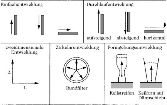 Die Entwicklung der Chromatogramme erfolgt in geschlossenen Gefäßen, die mit Lösungsmitteldämpfen gesättigt sind und einen konstanten Wassergehalt des Papiers garantieren. Die zu trennenden Substanzmengen liegen im Bereich von 5-50 mg und werden in 0,1-1%igen wässrigen Lösungen oder im Laufmittel gelöst auf einer Startlinie dosiert. Der Durchmesser des Startflecks soll nicht größer als 0,5mm sein. Nach einer längeren Laufzeit (30 Min.-3Std.) erhält man Substanzflecke, die in unterschiedlicher Entfernung von der Startlinie sichtbar sind oder sichtbar gemacht werden können. Je nach Richtung des Laufmittels unterscheidet man aufsteigende, absteigende und horizontale P. (Abb.).