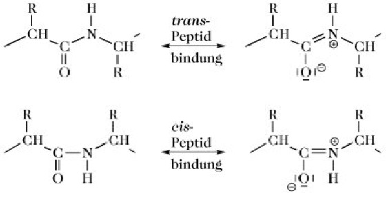 Peptidbindung, der wichtigste kovalente Bindungstyp zwischen Aminosäurebausteinen in Peptiden und Proteinen. Formal handelt es sich bei der P. um eine Säureamidgruppierung, die durch Reaktion der Carboxylgruppe einer Aminosäure mit der Aminogruppe einer zweiten Aminosäure gebildet wird. Die auf die Mesomerie der P. zurückzuführende C-N-Bindungsverkürzung konnte durch Röntgenkristallstrukturanalyse bestätigt werden. Durch die Aufhebung der freien Drehbarkeit um die Bindungsachse resultieren mit der trans- und cis- P. zwei in einer Ebene liegende Konformationen (Abb.). In nativen Peptiden und Proteinen dominiert die trans- P. Peptidbindungen, an denen das Stickstoffatom von Prolin beteiligt ist, sind stets cis-orientiert. Die relative Starrheit der P. hat starke Auswirkungen auf die Sekundärstruktur von Proteinen. In zyklischen Dipeptiden (2,5-Dioxopiperazinen) und Polyprolin sind ausschließlich cis- P. enthalten.