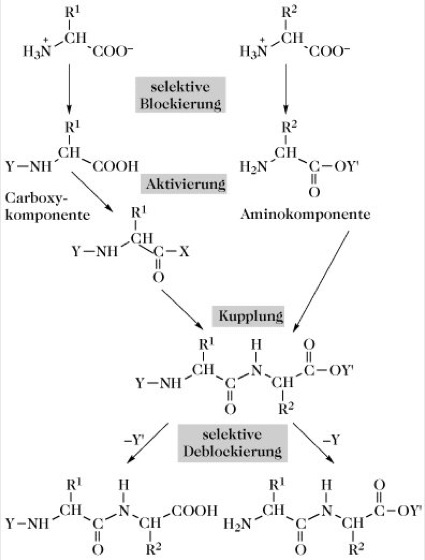Die P. unter milden Reaktionsbedingungen gelingt nur durch Aktivierung der Carboxyfunktion eines Reaktionspartners und liefert nur dann eindeutig definierte Produkte, wenn alle funktionellen Gruppen, die nicht am Peptidknüpfungsschritt beteiligt sind, temporär durch geeignete Schutzgruppen blockiert werden. Die P., d.h. die Knüpfung einer jeden Peptidbindung, ist ein Mehrstufenprozess (Abb. 1). Auf der ersten Stufe erfolgt eine selektive Blockierung der funktionellen Gruppen der Aminosäuren, wodurch diese gleichzeitig aus der reaktionsträgen Zwitterionenstruktur entbunden werden. Die mit der Carboxyfunktion in Reaktion tretende Aminosäure, die Carboxykomponente, wird an der α-Aminofunktion reversibel blockiert, während die mit der Aminofunktion angreifende zweite Aminosäure, die Aminokomponente, an der Carboxygruppe geschützt wird. Auf der zweiten Stufe erfolgt die Knüpfung der Peptidbindung durch Aktivierung der Carboxykomponente entweder im Eintopfverfahren oder in einem der Aktivierung folgenden separaten Schritt. Die nächste Stufe beinhaltet die selektive Abspaltung der Schutzgruppen, wenn nicht eine Dipeptidsynthese eine vollständige Deblockierung erfordert. Die partiell blockierten Dipeptidderivate werden dann für die weiteren Synthesestufen als Carboxy- oder Aminokomponenten eingesetzt. Zusätzlich zu dem essenziellen Schutz der Aminofunktion der Carboxykomponente und der Carboxyfunktion der Aminokomponente wird die P. dadurch komplizierter, dass von den 21 proteinogenen Aminosäuren neun weitere (Ser, Thr, Asp, Glu, Lys, Arg, His, Tyr und Cys) Drittfunktionen besitzen, die entsprechend den Erfordernissen selektiv geschützt werden müssen. Die unterschiedlichen Selektivitätsanforderungen führen zu einer formalen Unterscheidung zwischen intermediären und konstanten Schutzgruppen. Intermediäre Schutzgruppen dienen der Blockierung terminaler Amino- und Carboxygruppen und müssen aus diesem Grund selektiv abspaltbar sein, während die konstanten Schutzgruppen erst am Ende der Synthese eines Peptids bzw. manchmal auch auf der Stufe eines Zwischenprodukts entfernt werden. In der Tab. sind einige Schutzgruppen zusammengestellt.