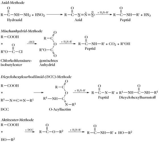 Die Aktivierung der Carboxykomponente erreicht man durch Einführen von elektroaffinen -I- bzw. -M-Substituenten (X), die sowohl am Carbonyl-C-Atom als auch am Carbonyl-O-Atom die Elektronendichte verringern, so dass der nucleophile Angriff der Aminokomponente begünstigt wird. Die Kupplungsreaktion sollte unter idealen Bedingungen in hoher Geschwindigkeit ohne Racemisierung und Nebenreaktionen und in hoher Ausbeute bei Einsatz äquimolarer Mengen an Carboxy- und Aminokomponente ablaufen. Von den mehr als 140 beschriebenen Kupplungsmethoden haben nur wenige praktische Bedeutung erlangt, wie die Azid-Methode, die Mischanhydrid-Methode, die Aktivester-Methode, die Dicyclohexylcarbodiimid-Methode (Abb. 2) sowie das Dicyclohexylcarbodiimid/Additiv-Verfahren. Von großer Bedeutung sind neuerdings Kupplungsreagenzien, die eine in-situ-Bildung von Aktivestern ermöglichen, wie Benzotriazol-1-yl-oxy-tris(dimethylamino)-phosphonium-hexafluorophosphat (BOP), 2-(1H)-benzotriazol-1-yl-1,1,3,3-tetramethyluronium-hexafluorophosphat (HBTU) oder das 7-Azabenzotriazol-1-yl-oxytris(pyrrolidino)-phosphonium-hexafluorophosphat (PyAOP) neben anderen Uronium- und Phosphoniumsalzen. Während die Darstellung von Di- und Tripeptiden hinsichtlich der Wahl der Schutzgruppen und Kupplungsmethoden keine großen Schwierigkeiten bereiten, ist für den Aufbau von langen Peptidketten mit definierter Aminosäuresequenz eine exakte Planung unerlässlich. So versteht man unter der Strategie der P. die Reihenfolge der Verknüpfung der Aminosäurebausteine zum Peptid, wobei man zwischen der schrittweisen Kettenverlängerung und der Segmentkondensation unterscheidet. Solche P. können sowohl in homogener Lösung (konventionelle P.) als auch an einer zweiten Phase durchgeführt werden, wobei die Festphasen-Peptidsynthese (Merrifield-Synthese) eine breite Anwendung fand. Durch die Taktik der P. wird die optimale Schutzgruppenkombination und die für jede Knüpfung einer Peptidbindung geeignete Kupplungsmethode ausgewählt. Bei konventionellen P. sind hinsichtlich der Auswahl der Schutzgruppenkombination mit der Maximal- und der Minimalschutztaktik zwei extreme Varianten möglich, die beide sowohl Vorteile als auch Nachteile besitzen. Eine maximale Blockierung der Seitenkettenfunktionen garantiert eine optimale Absicherung gegenüber Nebenreaktionen sowie eine größere Variabilität der Schutzgruppen und Kupplungsmethoden. Die damit verbundenen Löslichkeitsprobleme stellen einen limitierenden Faktor dieser Taktik dar. Generell werden in der Praxis nicht die beiden extremen Taktiken benutzt, sondern man bevorzugt in Abhängigkeit von der aufzubauenden Sequenz eine Annäherung an die eine oder andere Variante.