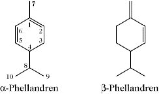 Phellandrene, zweifach ungesättigte monozyklische Monoterpene (p-Menthadiene), die als α-P. und β-P. vorkommen (Abb., Tab.).