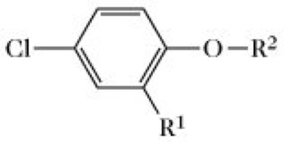Phenoxycarbonsäureherbizide. R2 = CH(CH3)-COOH, R1 = Cl: Dichlorprop-P; R1 = CH3: Mecoprop-P.